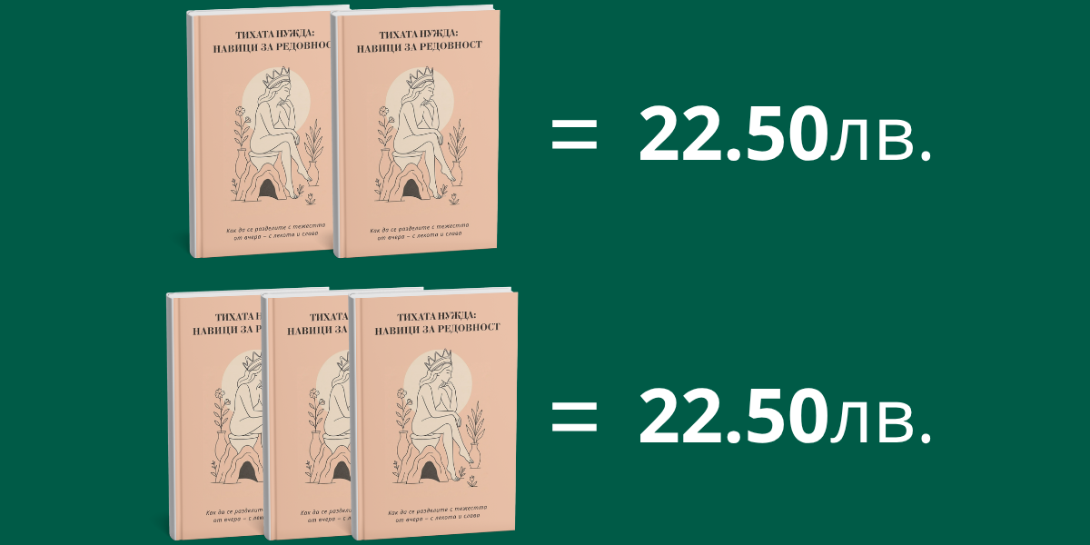 Да! При поръчка на два екземпляра от „Тихата нужда“ получаваш отстъпка от 22,48 лв от общата стойност. Много жени избират този вариант, за да подарят книгата на приятелка или сестра – защото знаят, че всяка от нас се е сблъсквала с този проблем по един или друг начин.